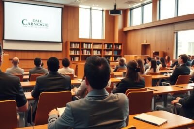 O treinamento dale carnegie é conhecido por ajudar no desenvolvimento pessoal. Ele melhora as habilidades interpessoais. Criado por Dale Carnegie, este programa visa transformar pessoas em melhores comunicadores e líderes inspiradores. No Brasil, a importância desse treinamento cresce, principalmente em empresas. Isso porque a comunicação eficaz é muito importante. Ela ajuda os times a trabalharem melhor e alcançarem grandes resultados. O Que é o Treinamento Dale Carnegie? O treinamento Dale Carnegie começou em 1912. Foi quando Dale Carnegie escreveu "Como Fazer Amigos e Influenciar Pessoas". Desde então, se expandiu globalmente. Oferece cursos que destacam fundamentos do treinamento focados no crescimento pessoal. Este método melhora como nos comunicamos com os outros. História e Fundamentos A história do treinamento Dale Carnegie é rica e focada no desenvolvimento humano. Seus princípios guiam os alunos a entender melhor a si próprios e aos outros. Isso cria um espaço ideal para evoluir pessoal e profissionalmente. Abordagem do Treinamento A abordagem combina prática com teoria. Isso permite que os alunos aprendam fazendo. Enfatizando os relacionamentos interpessoais, os cursos preparam as pessoas para serem mais empáticas e influenciadoras no dia a dia. Objetivos Principais Os objetivos do treinamento são elevar a capacidade de influenciar de modo positivo e aumentar a autoconfiança. Isso é essencial, sobretudo para falar em público. Ajuda aos participantes a enfrentarem diversos desafios no ambiente profissional. Benefícios do Treinamento Dale Carnegie O Treinamento Dale Carnegie traz muitos benefícios para quem participa. Melhora a forma como você se comunica, desenvolve suas habilidades de liderança e aumenta sua autoconfiança. Essas qualidades são muito importantes para quem quer se destacar no trabalho.…